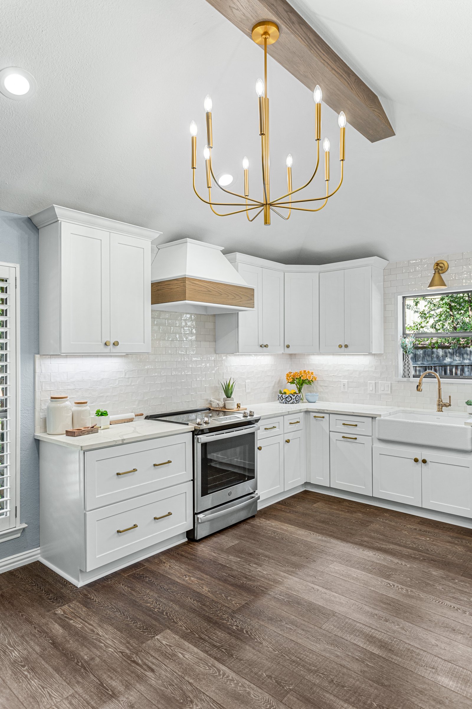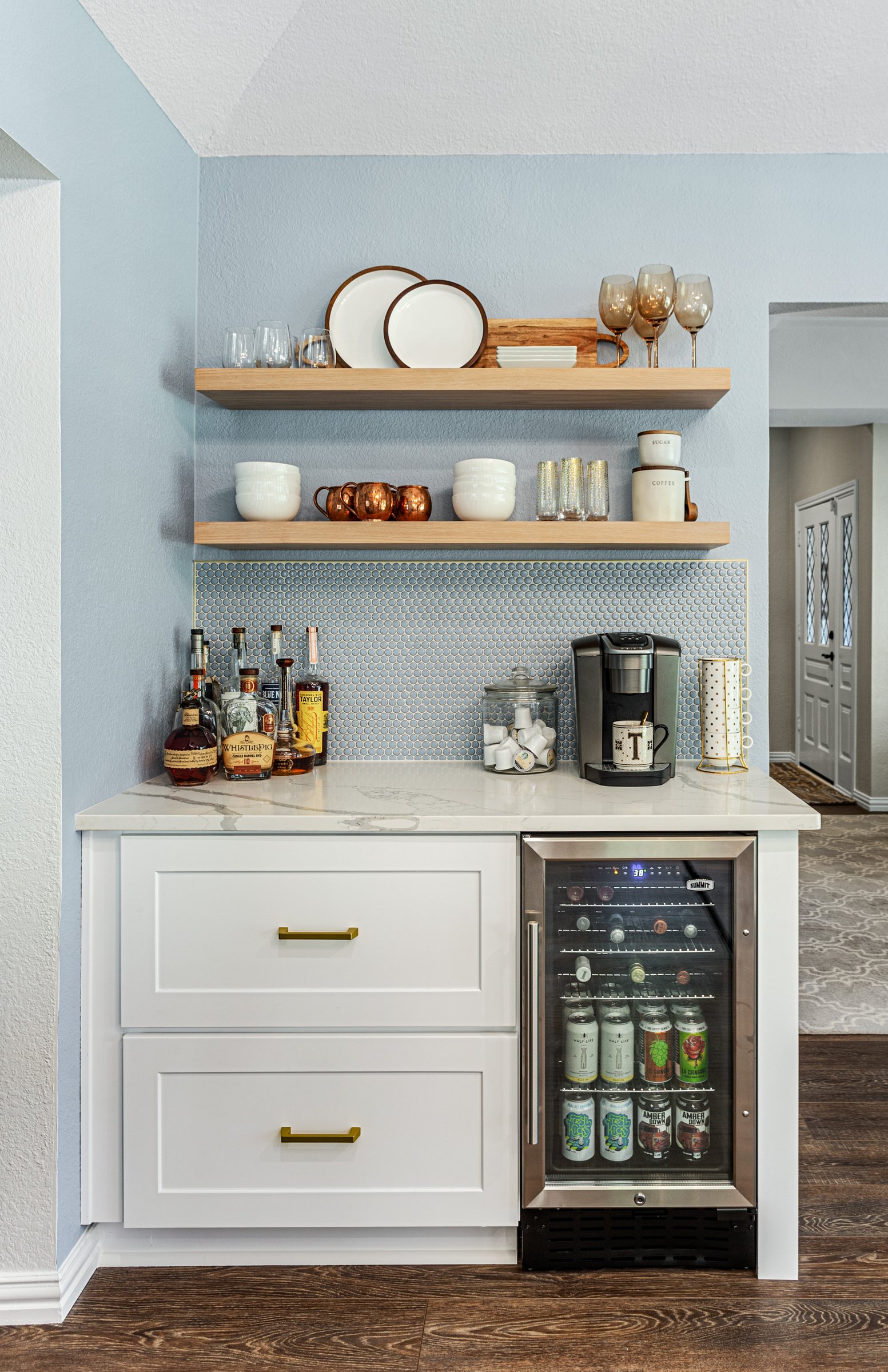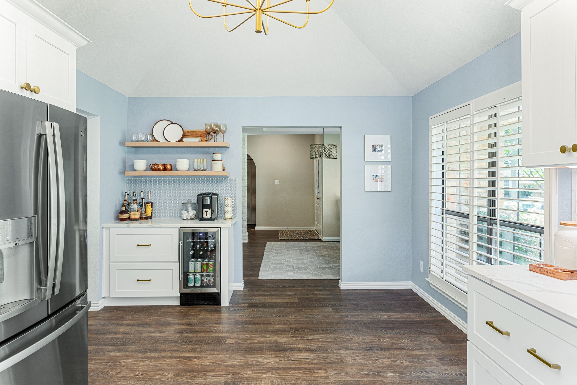 We originally remodeled a guest bathroom for this client in Mansfield, but they came back for a kitchen remodel! Using an external interior designer, they kept their existing luxury vinyl plank flooring (LVP) but changed everything else. We installed all new ready-made cabinets, countertops, and backsplash, including a cool beverage station. This kitchen remodel also involved reworking ceiling beams.
