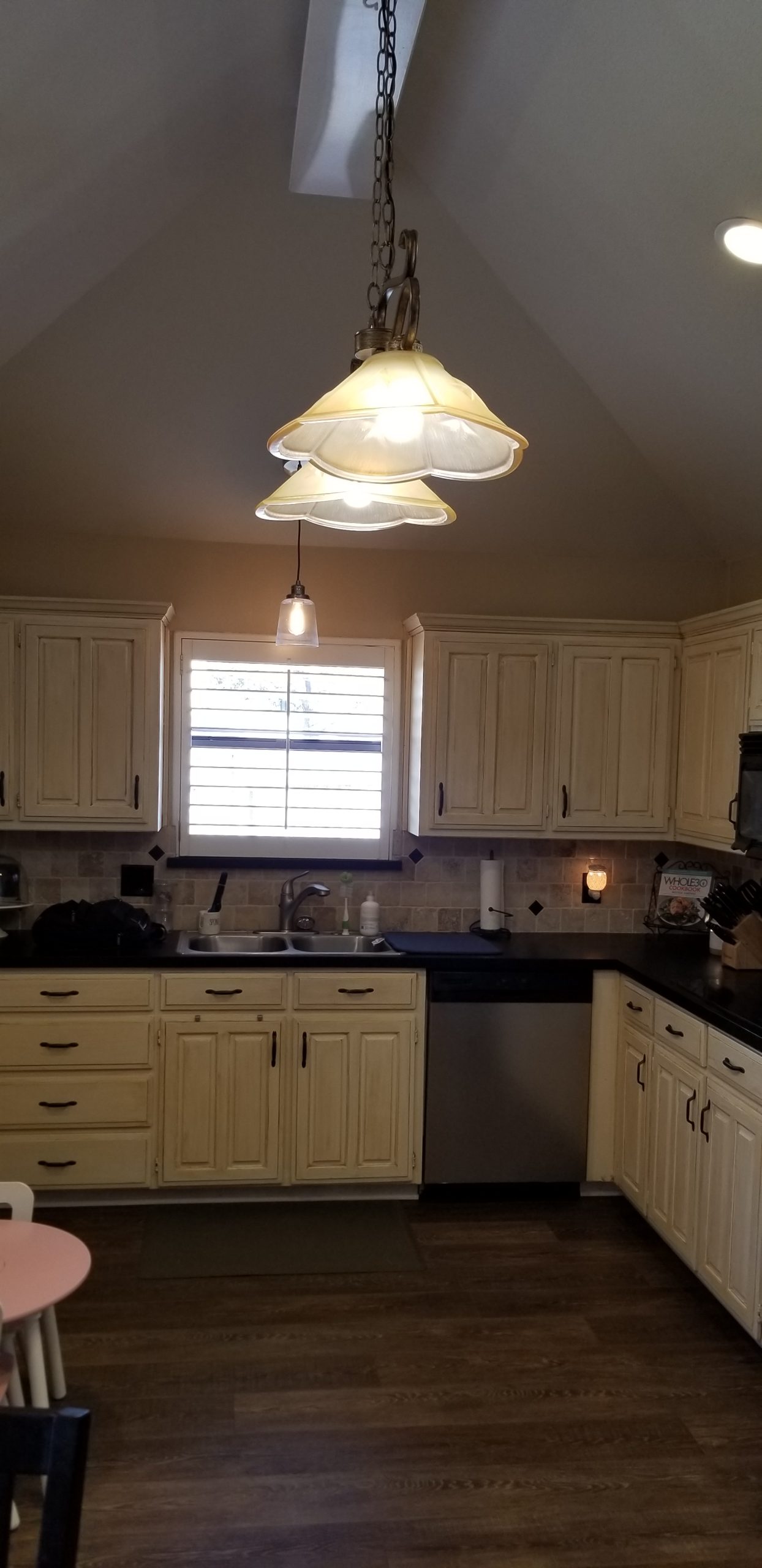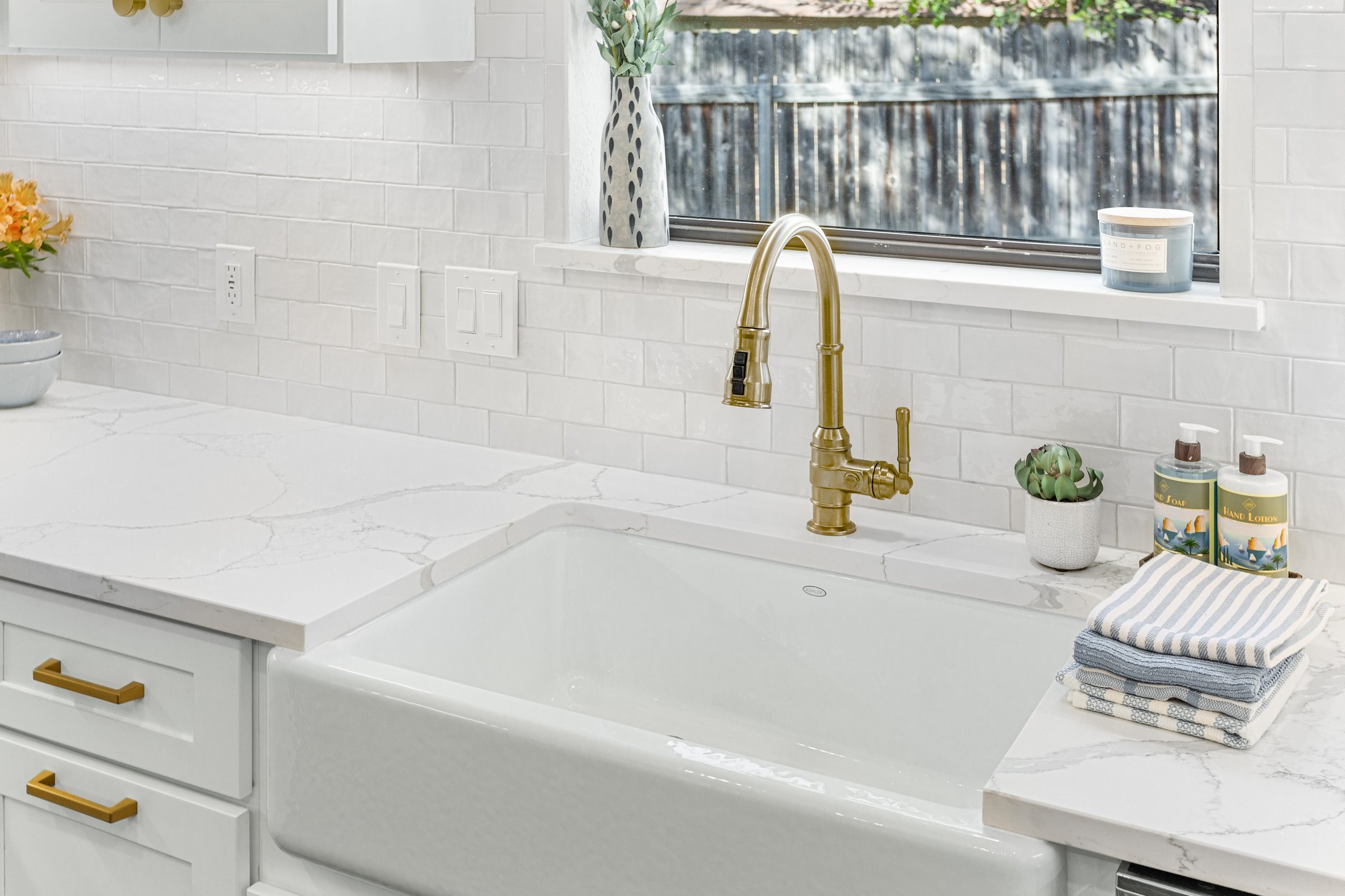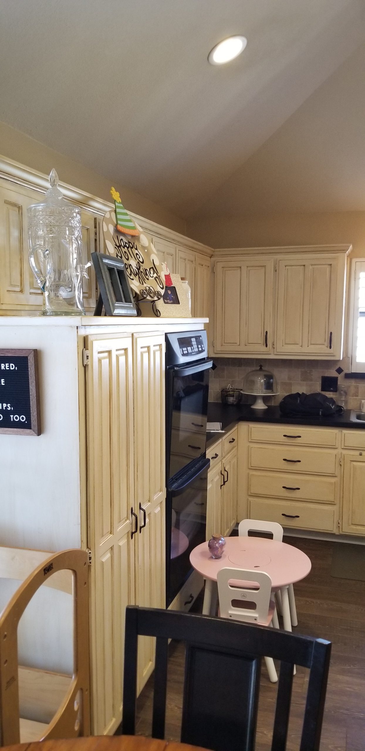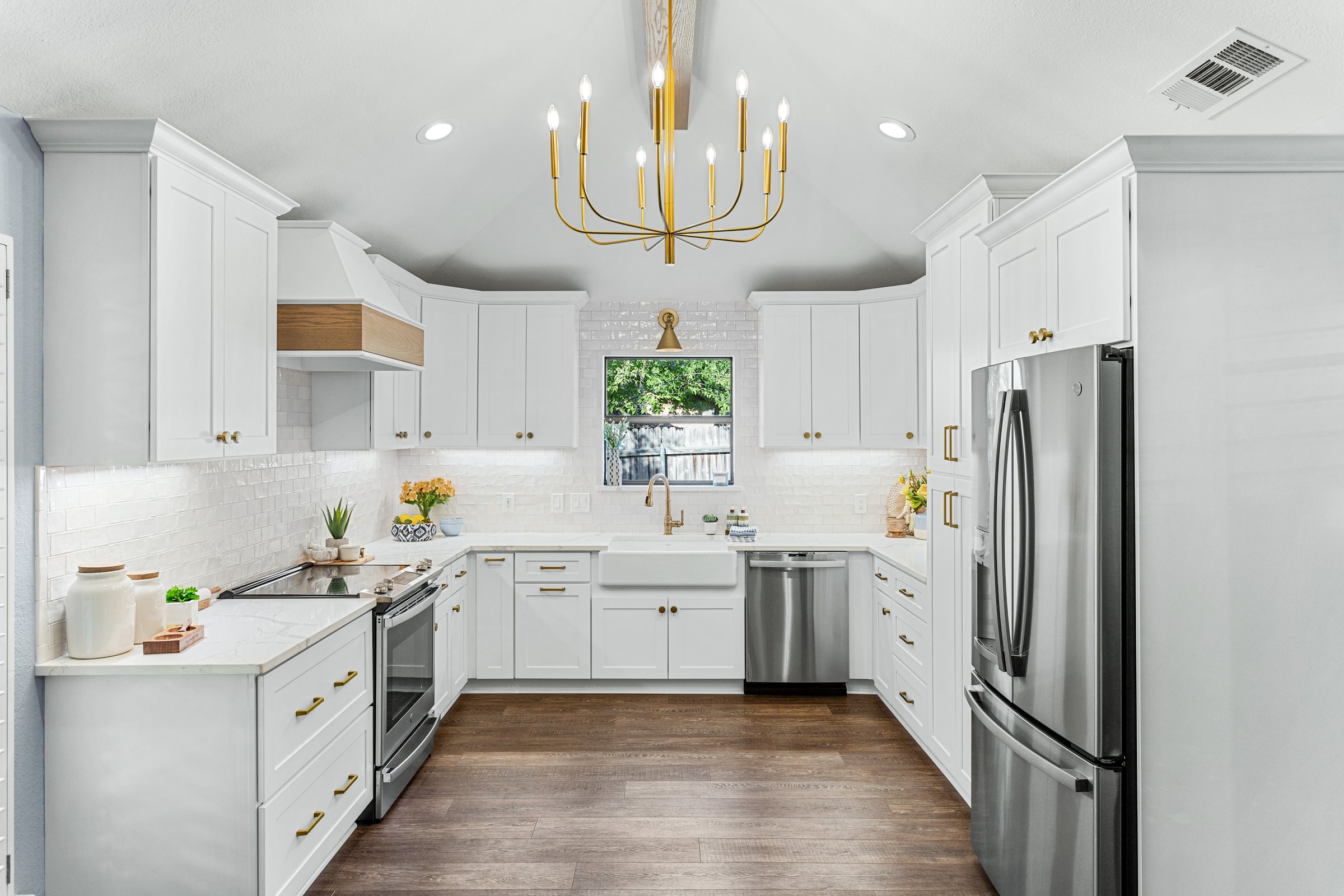 We originally remodeled a guest bathroom for this client in Mansfield, but they came back for a kitchen remodel! Using an external interior designer, they kept their existing luxury vinyl plank flooring (LVP) but changed everything else. We installed all new ready-made cabinets, countertops, and backsplash, including a cool beverage station. This kitchen remodel also involved reworking ceiling beams.