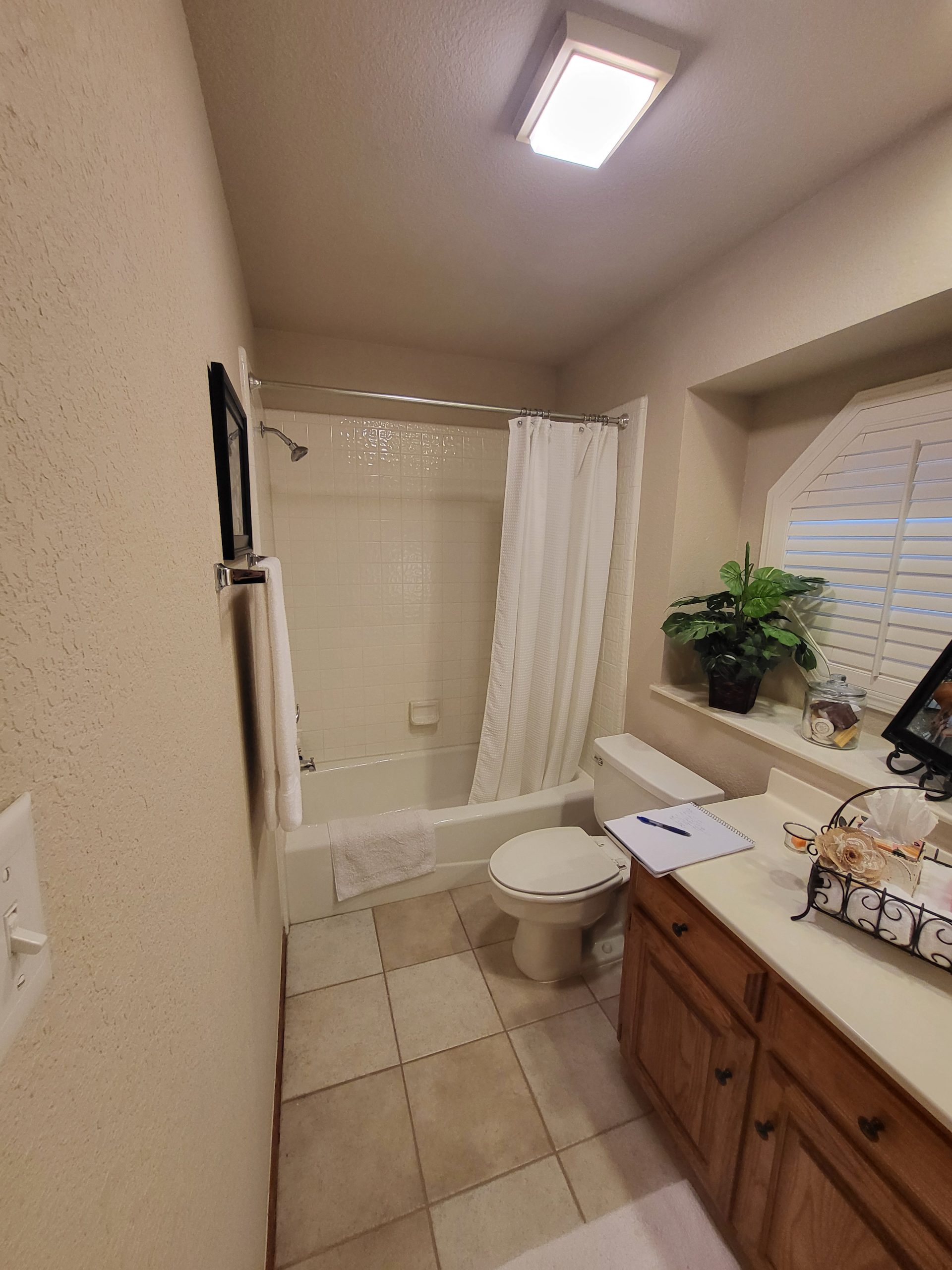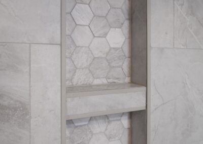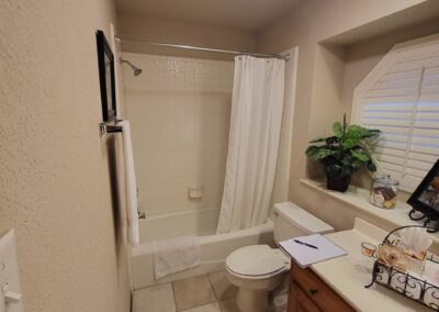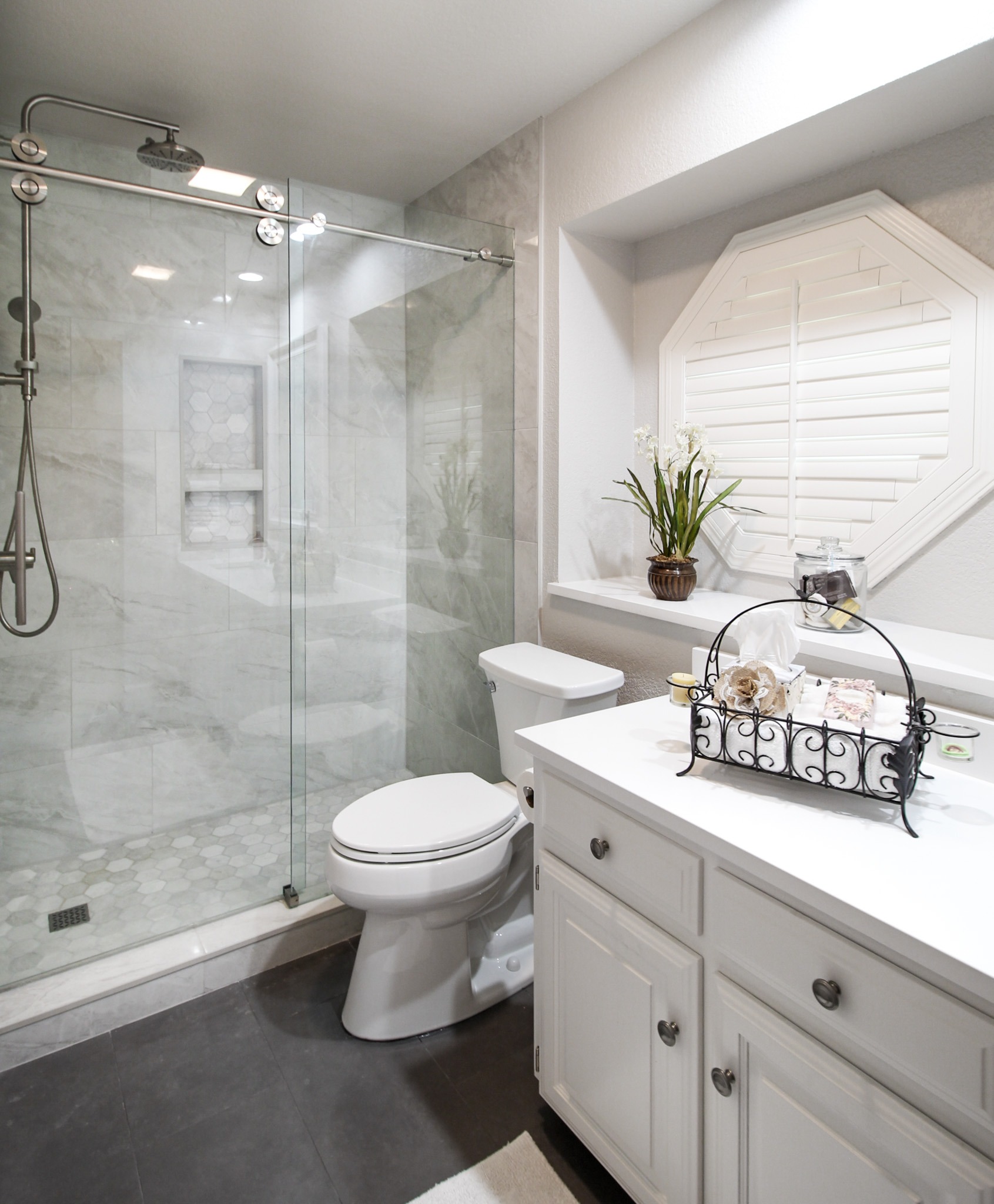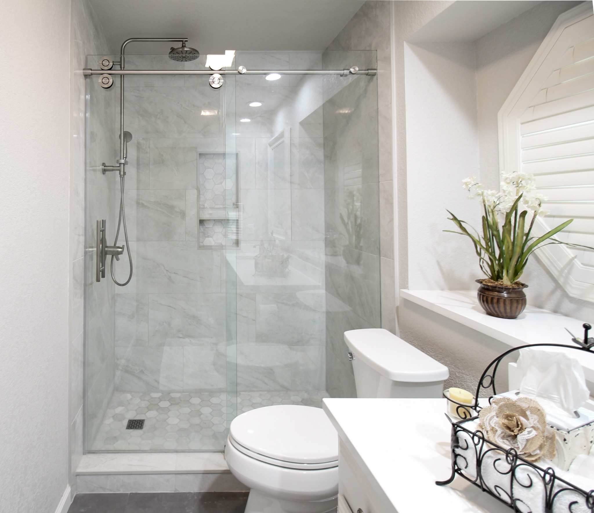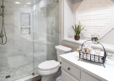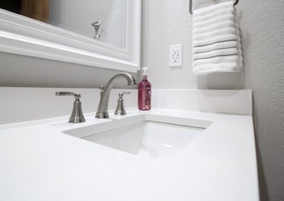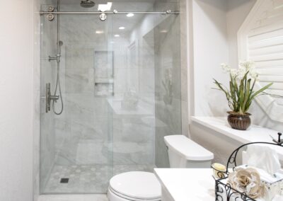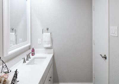 Our clients in North Richland hills needed a change in their guest bathroom. We helped take it from beige and outdated to bright and modern. The new bathroom has new tile flooring and quartz countertops. We painted their existing cabinets and converted the alcove tub to a custom walk-in shower with a barn-style sliding door.
