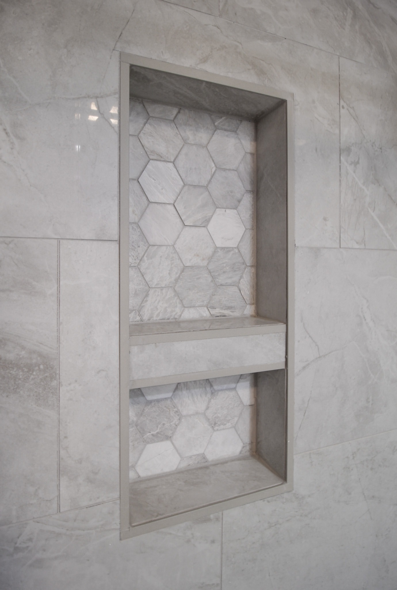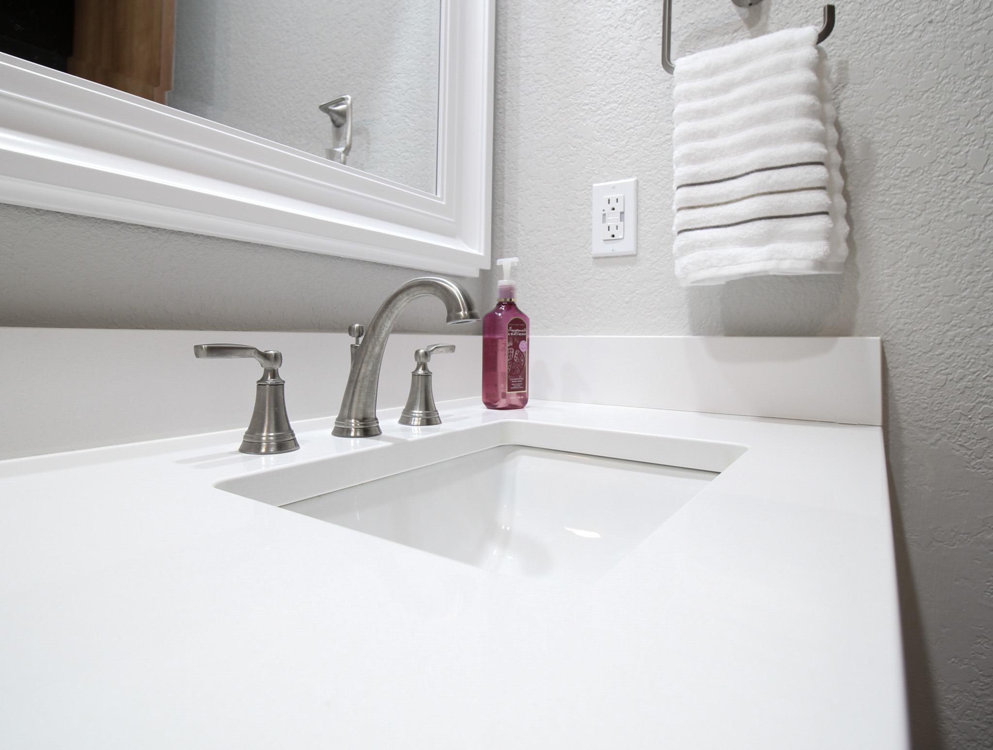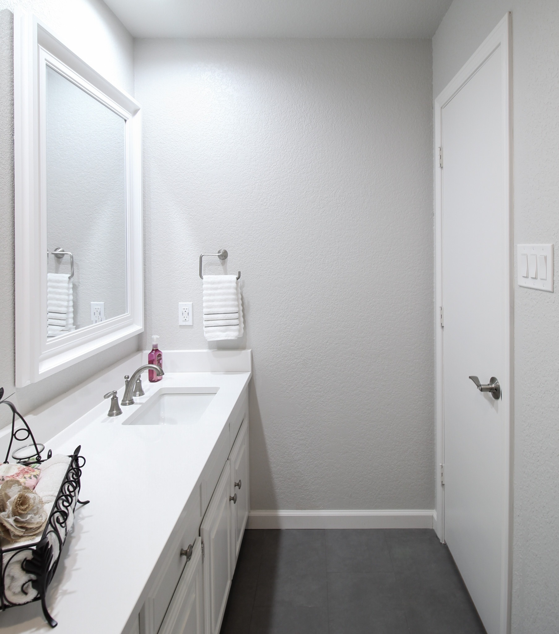 Our clients in North Richland hills needed a change in their guest bathroom. We helped take it from beige and outdated to bright and modern. The new bathroom has new tile flooring and quartz countertops. We painted their existing cabinets and converted the alcove tub to a custom walk-in shower with a barn-style sliding door.