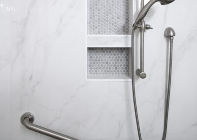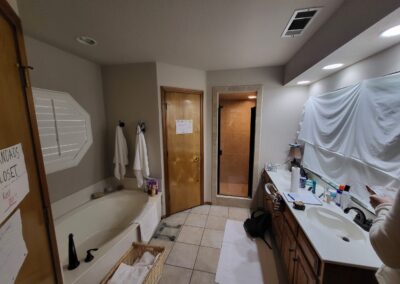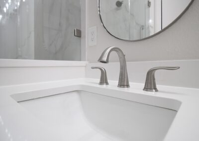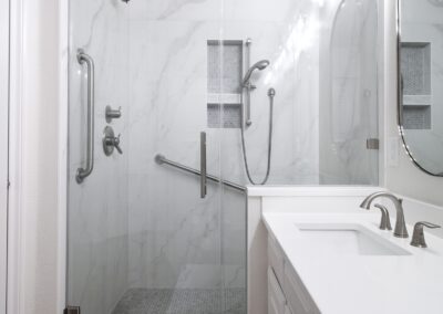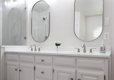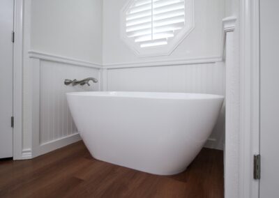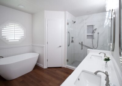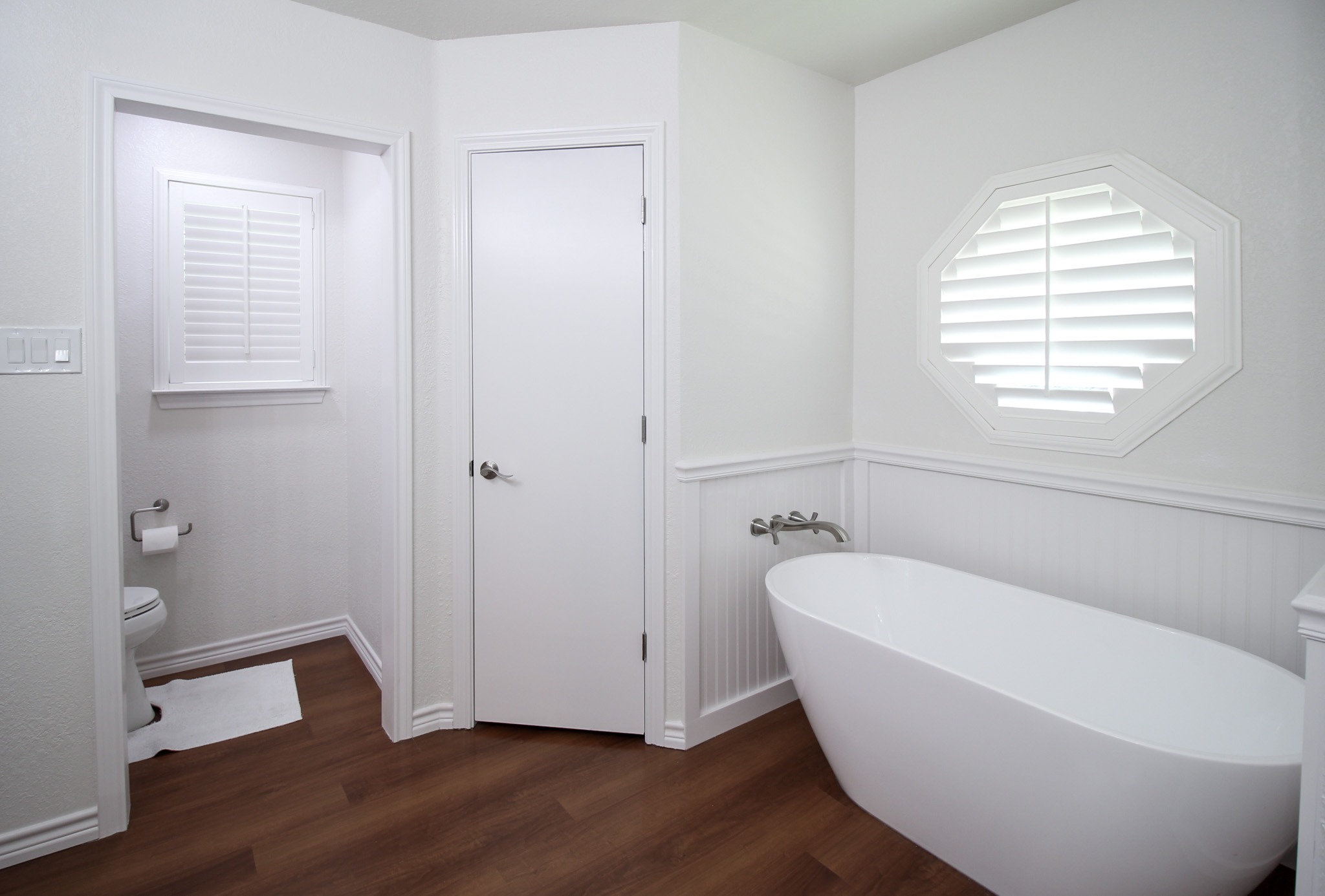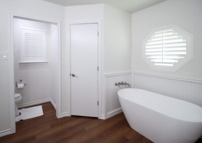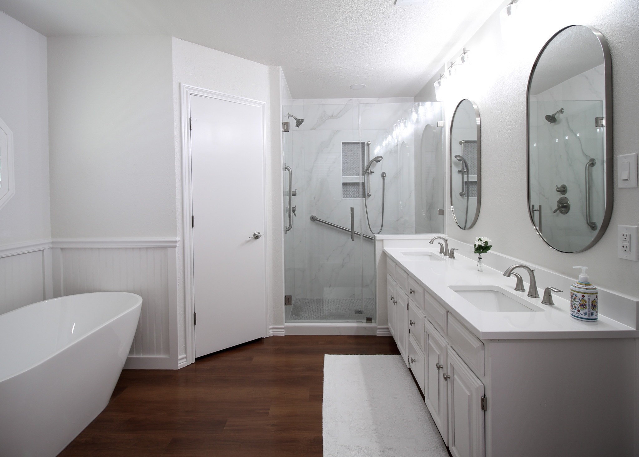 This aging couple in North Richland Hills needed a shower that was more accessible. We helped them brighten up their master bathroom by updating all the materials. They decided to change their alcove tub to a modern, freestanding one and remove the wall that closed off the shower. We installed new LVP flooring, quartz countertops, and tile in the shower. Along with new paint on the walls and existing vanity cabinets, we think these changes made a big difference.