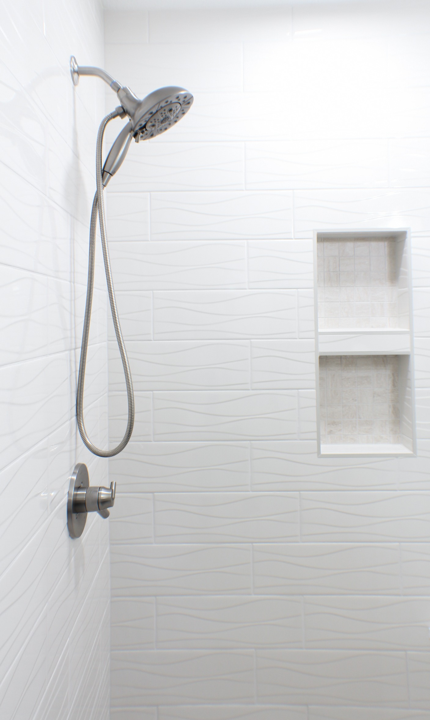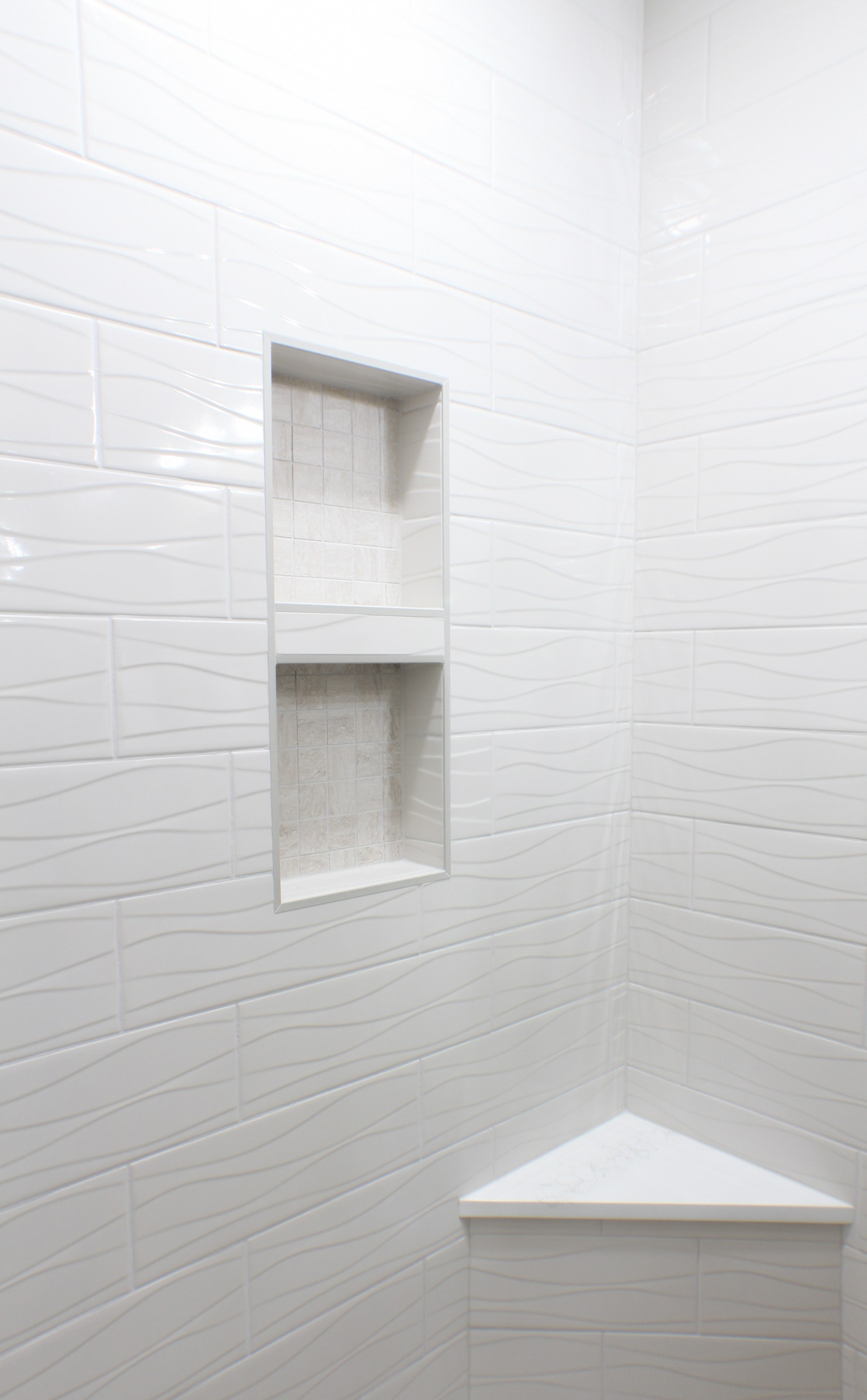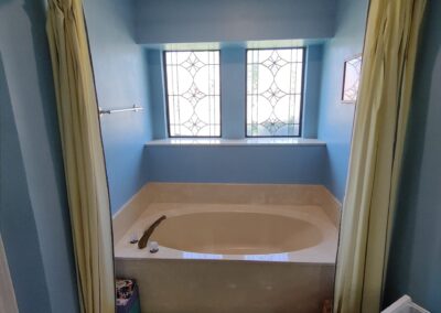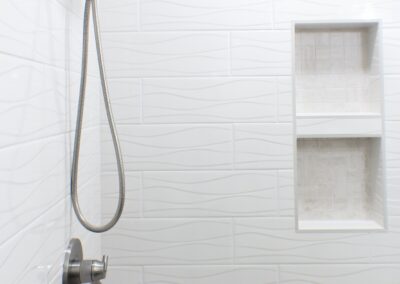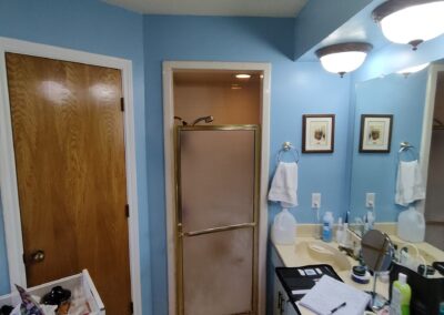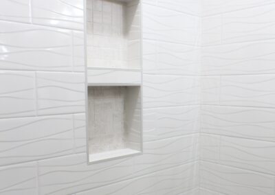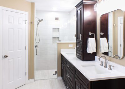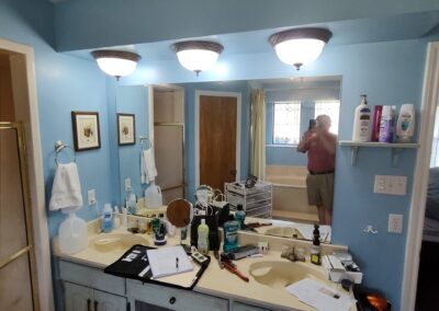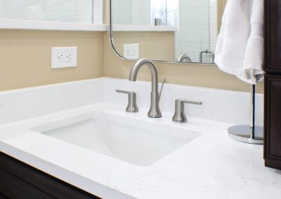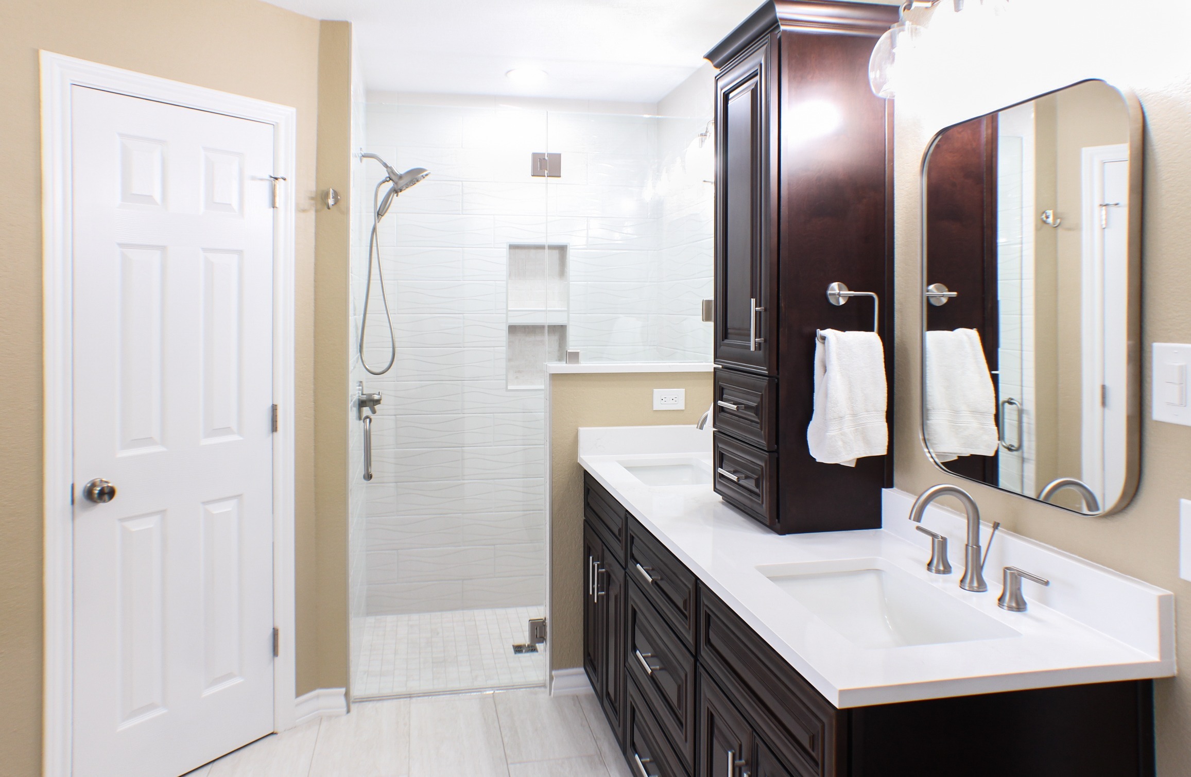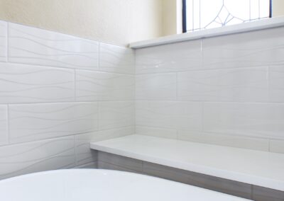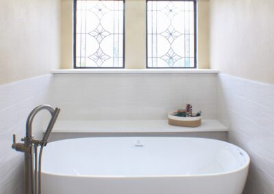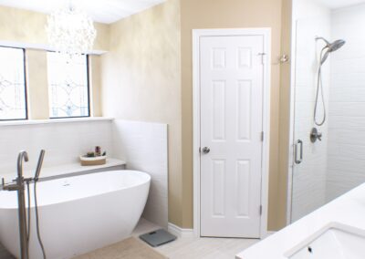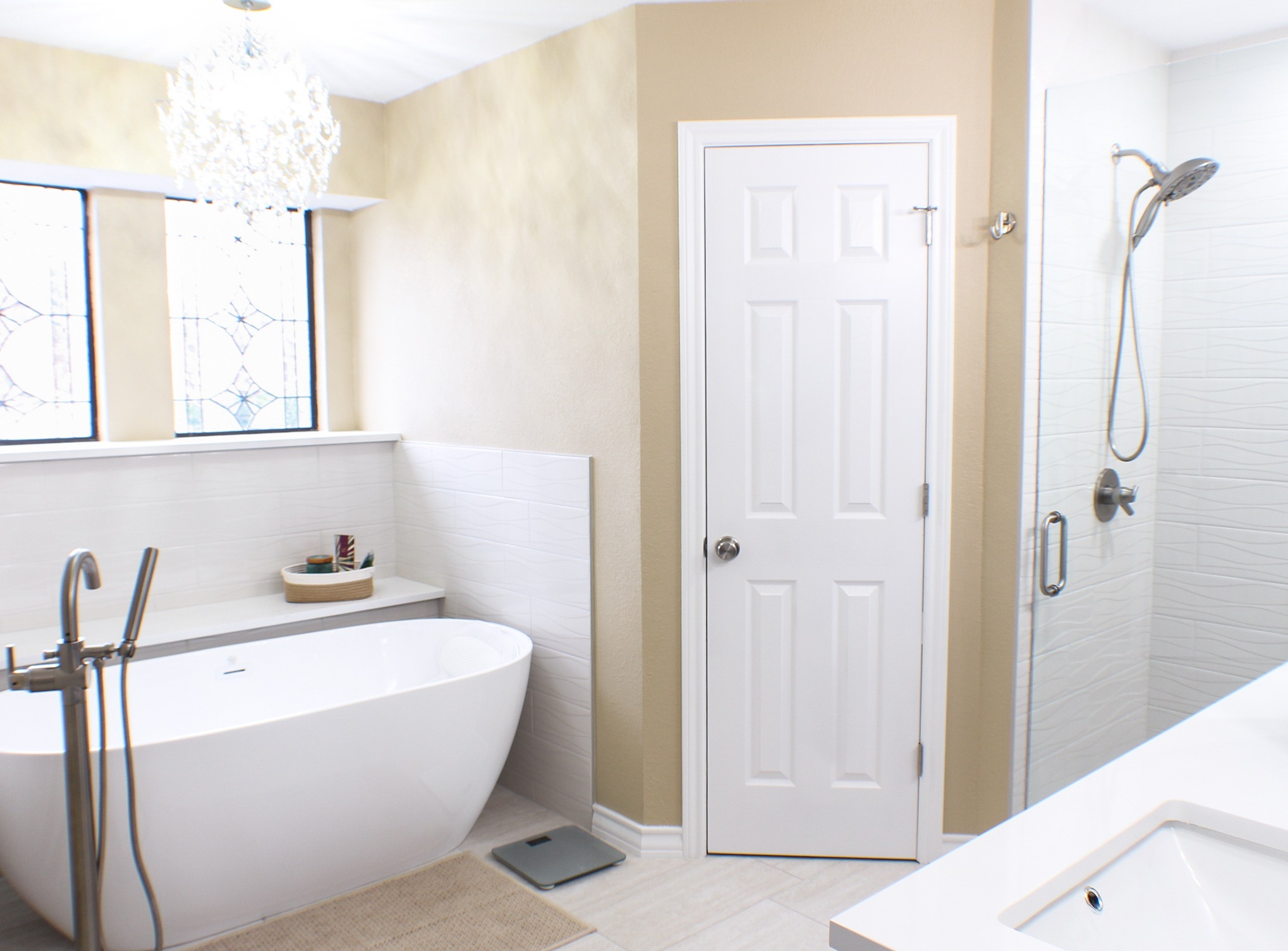 This is the 3rd project we completed for our clients in Pantego. This bathroom was outdated in more than one way, from the closed-off shower to the flush mount lights above the vanity. For the renovation, we opened up the shower and added glass, and we replaced the alcove tub with a freestanding one. Our clients opted for new tile floors, ready-made vanities, and quartz countertops.