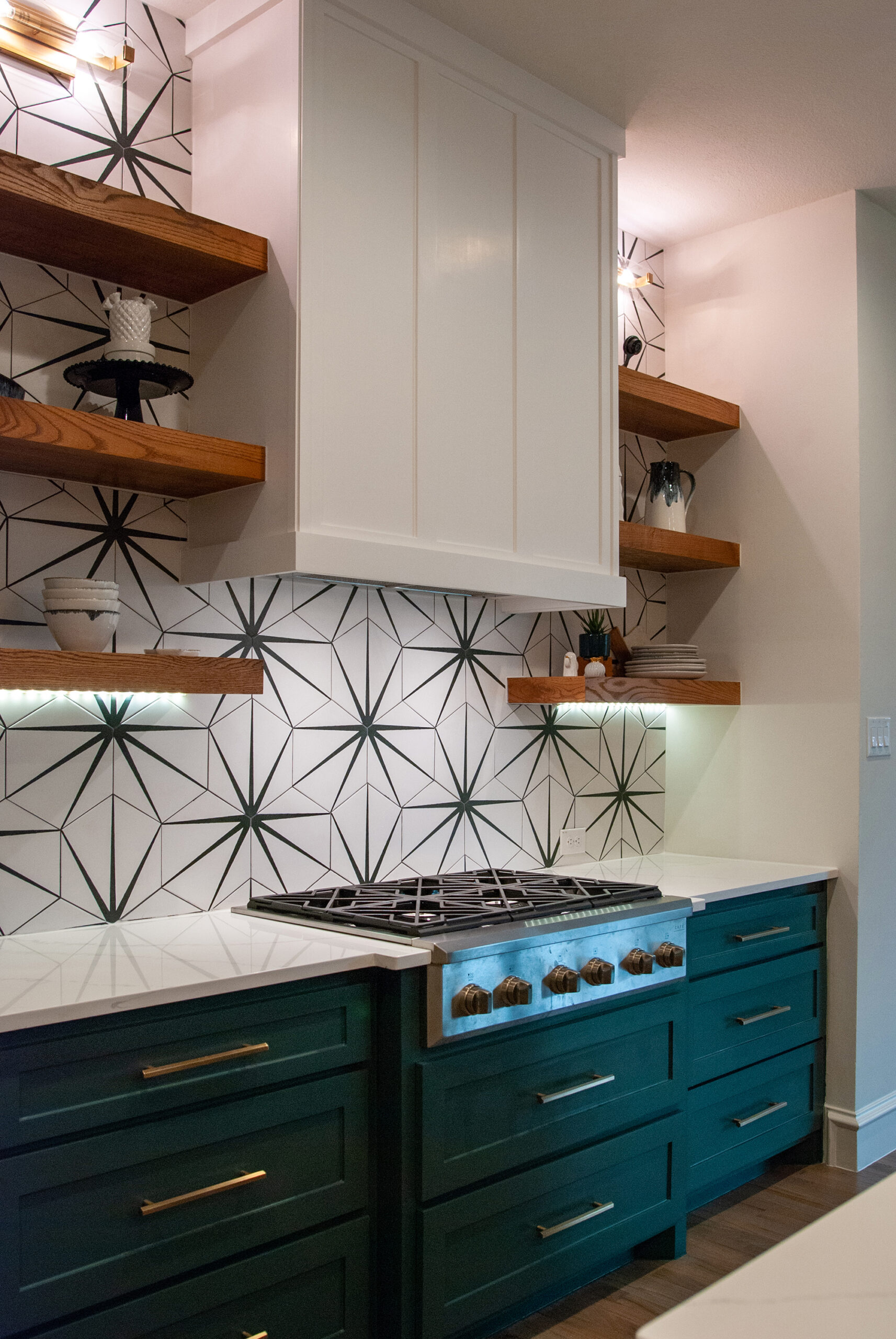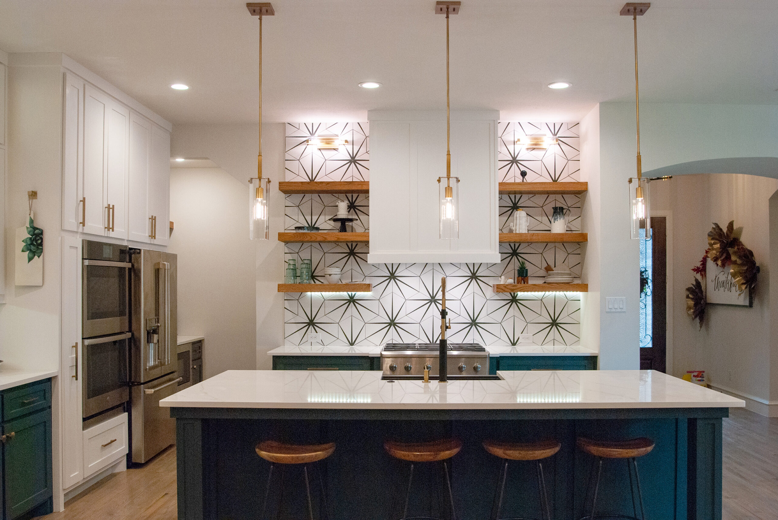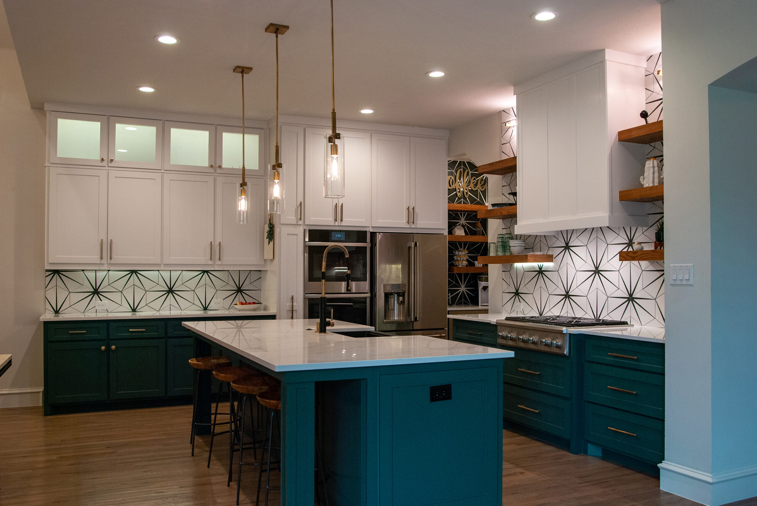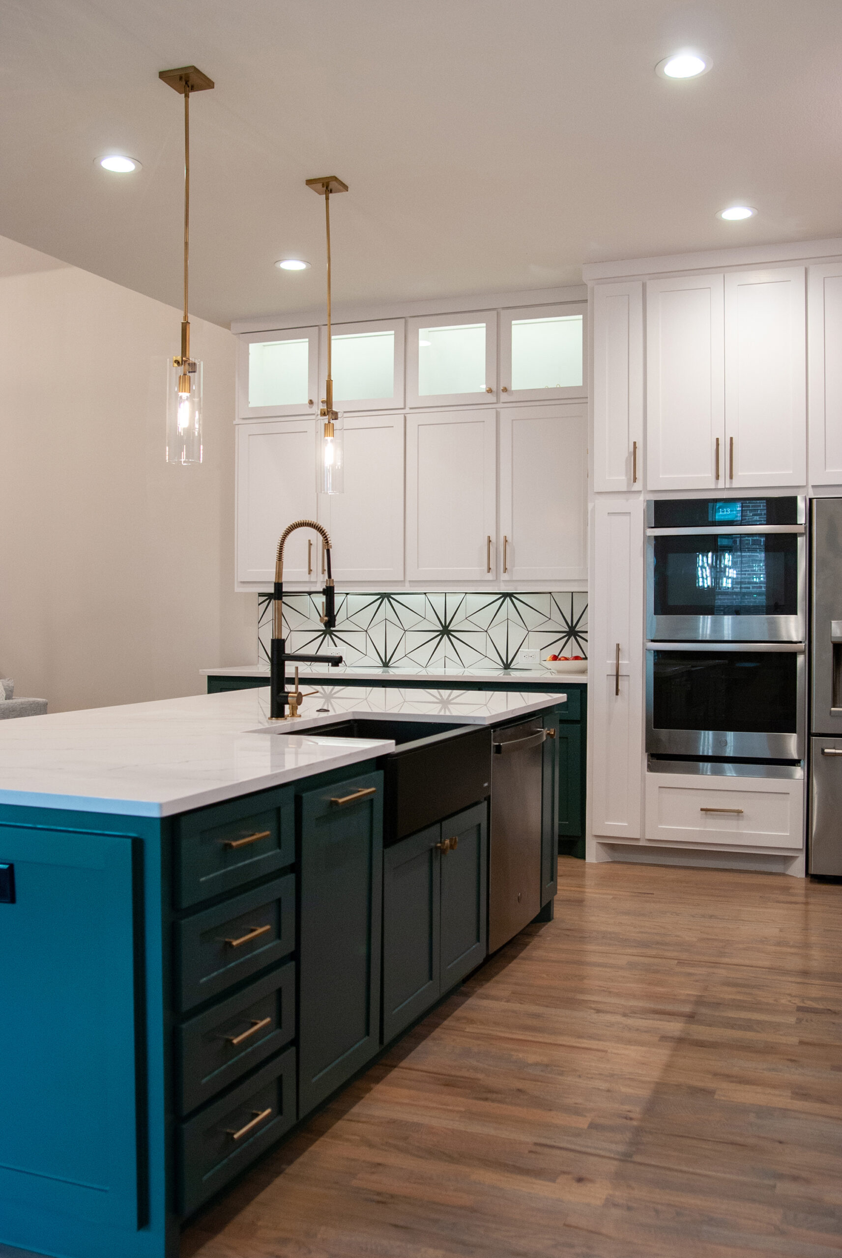 This client in Southlake used Home Front to achieve a unique and fun kitchen. The clients kept some of their existing cabinets, but added new custom elements to make the space more modern. We absolutely love the blue painted cabinets, the custom, geometric backsplash and the huge island.
