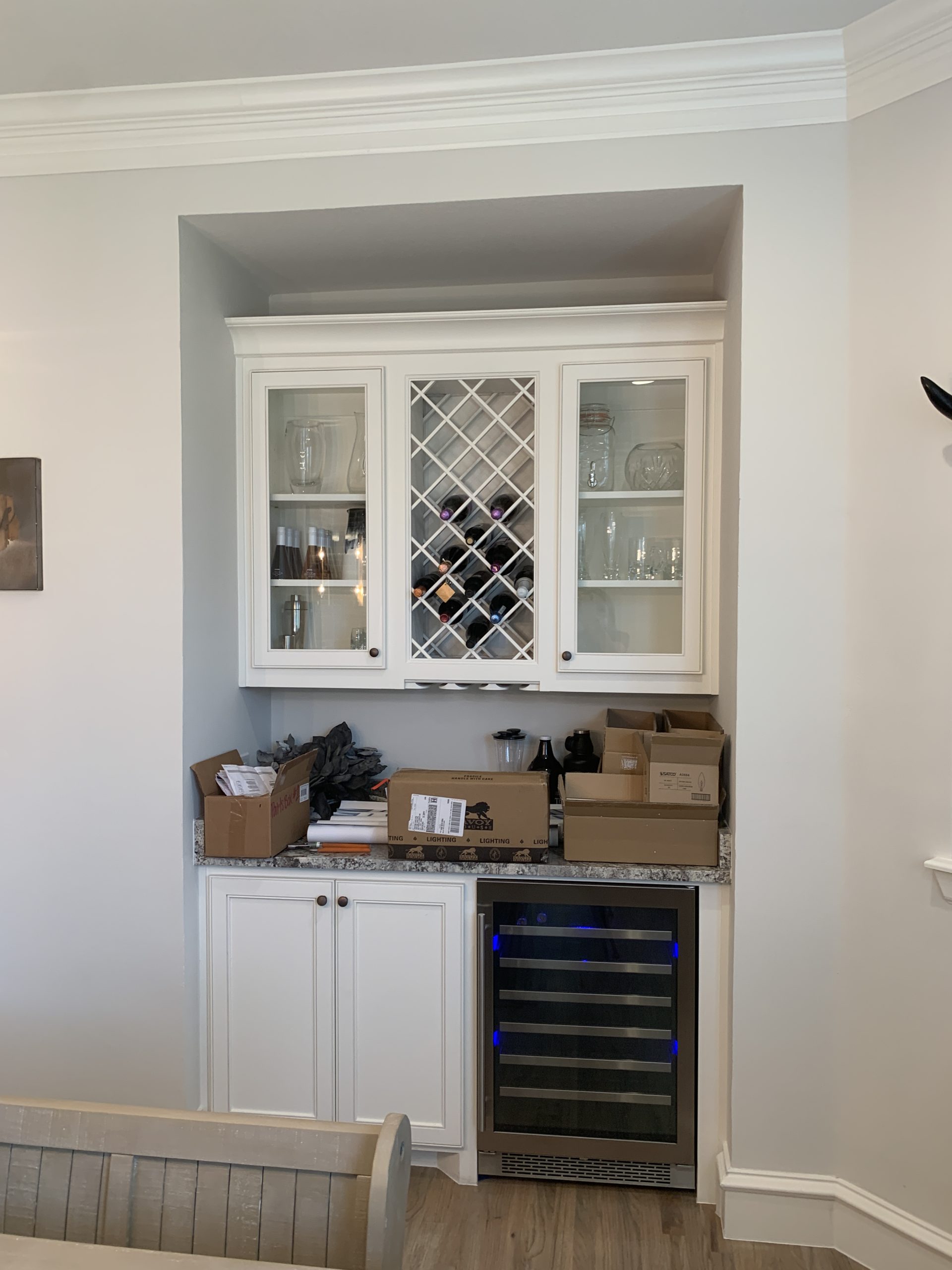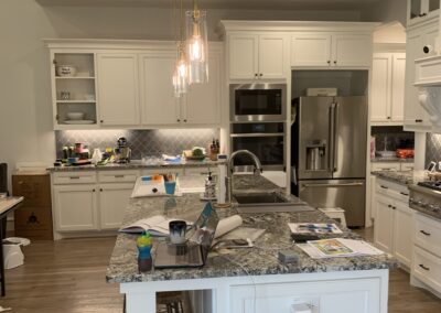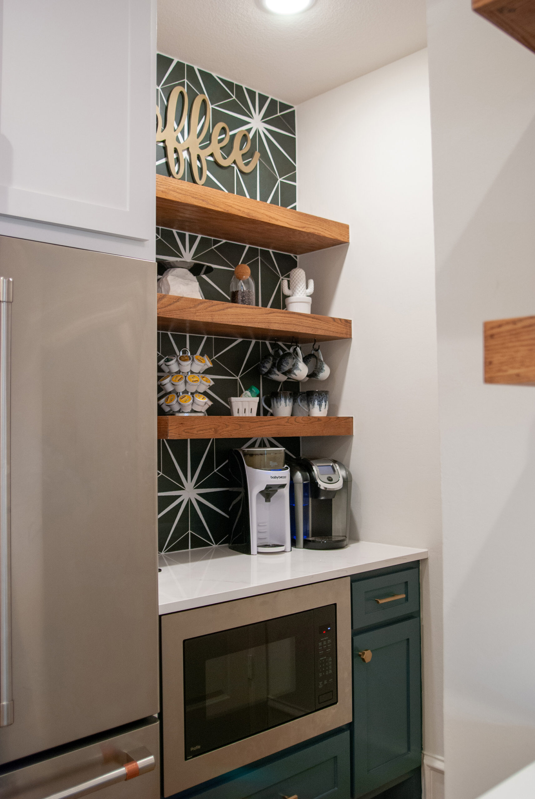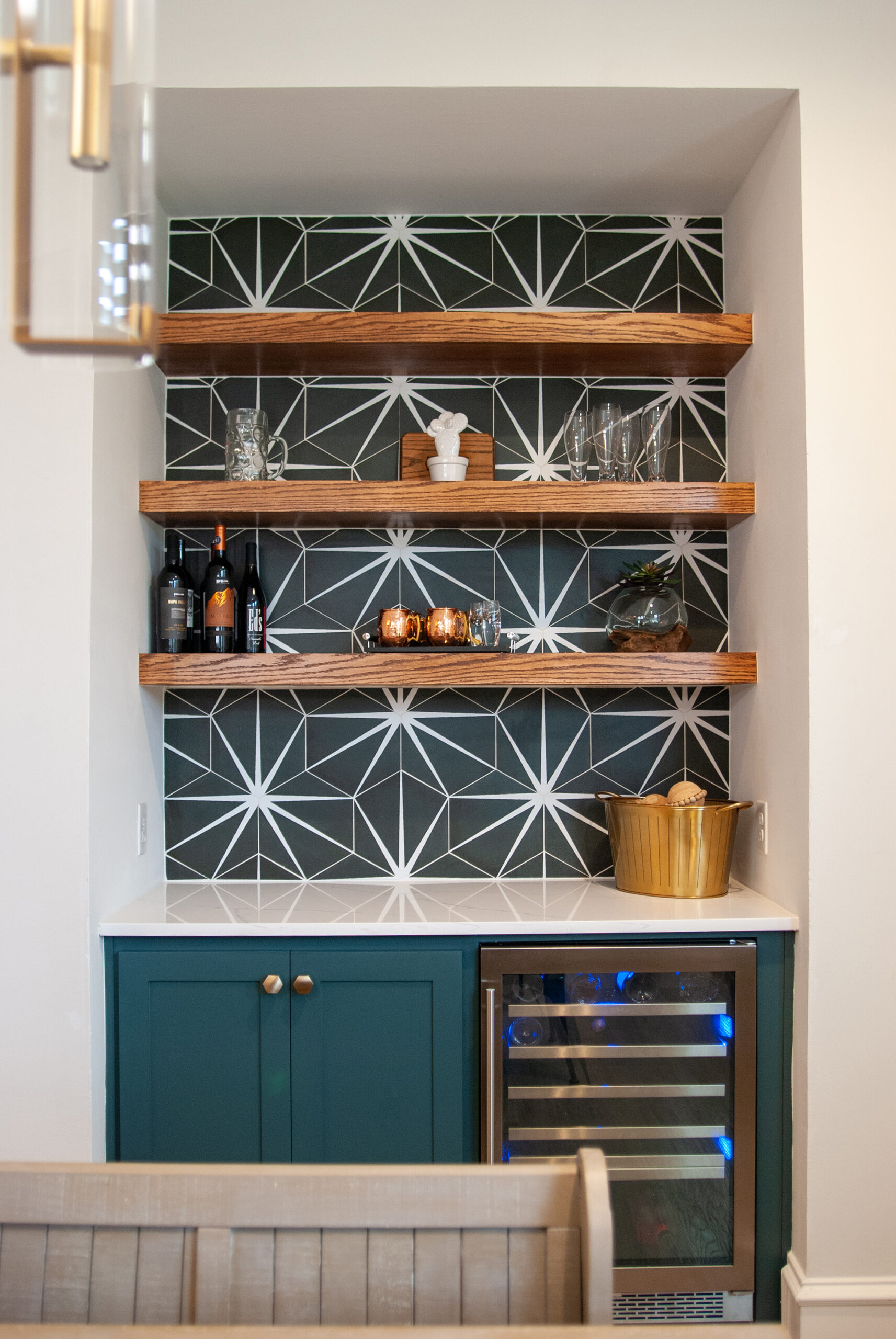 This client in Southlake used Home Front to achieve a unique and fun kitchen. The clients kept some of their existing cabinets, but added new custom elements to make the space more modern. We absolutely love the blue painted cabinets, the custom, geometric backsplash and the huge island.