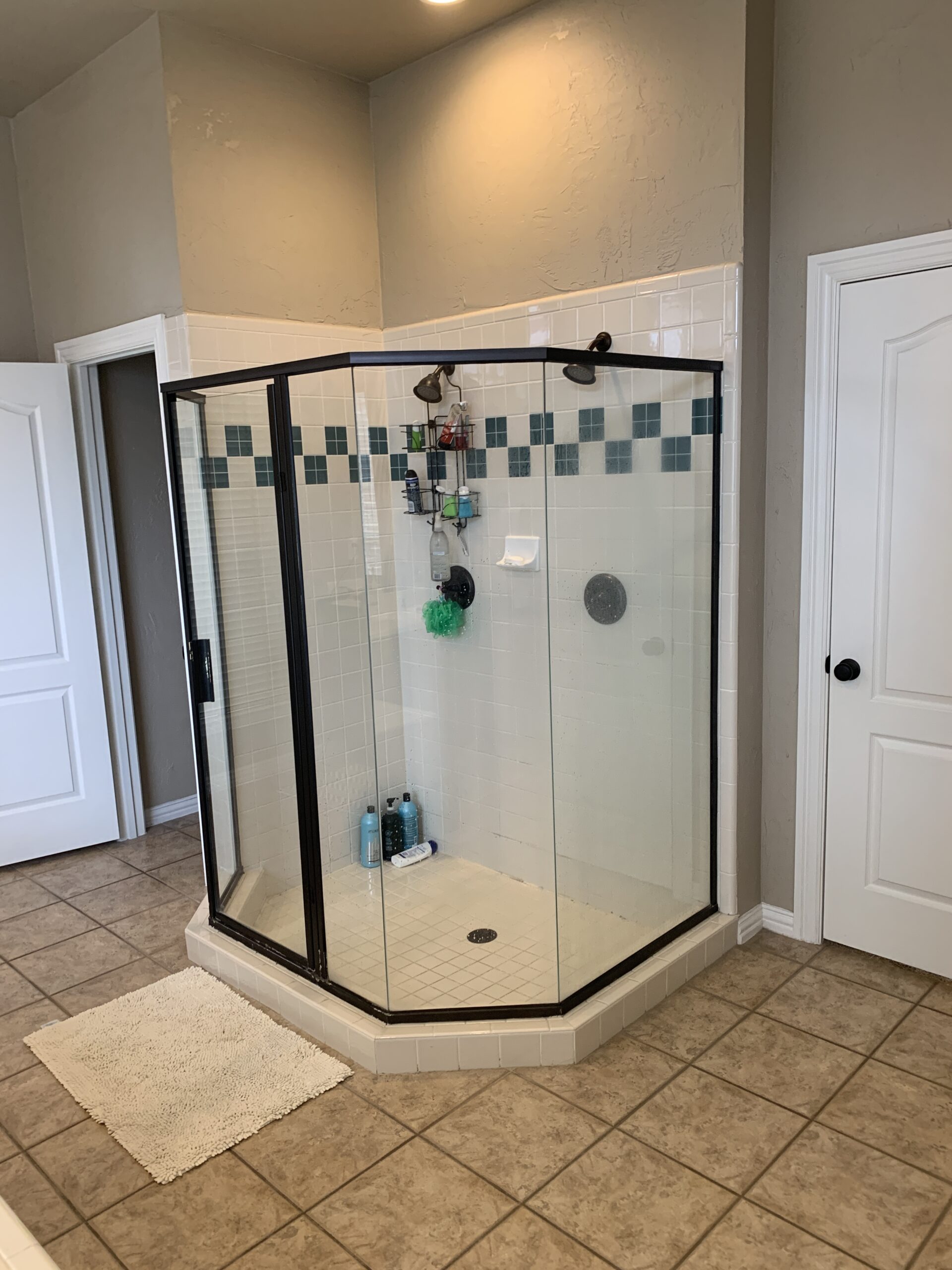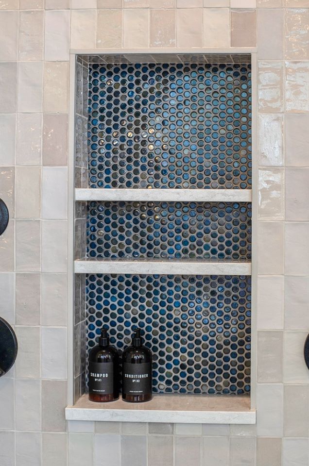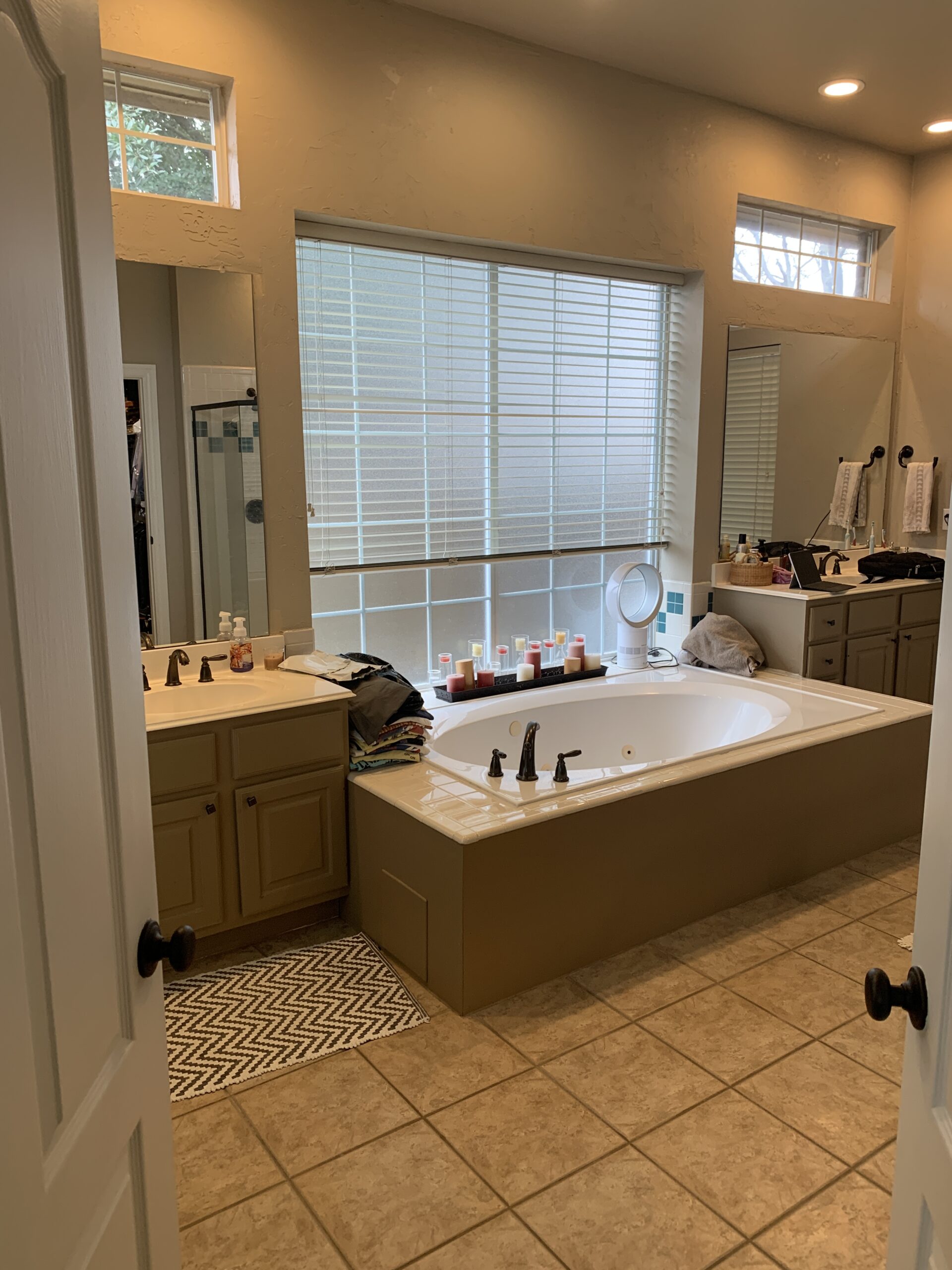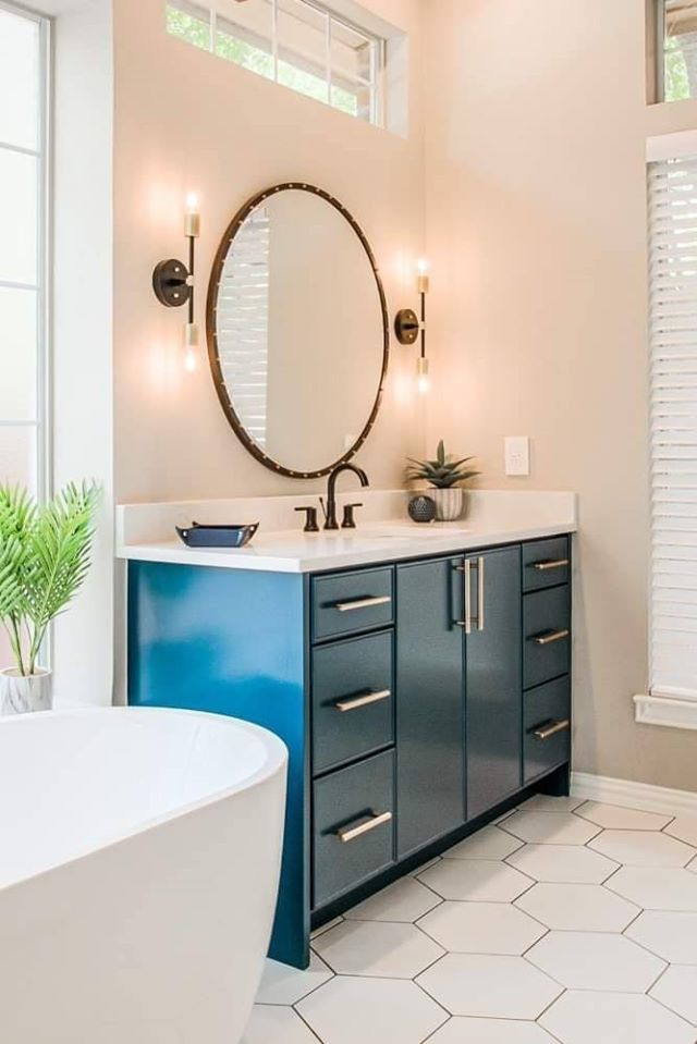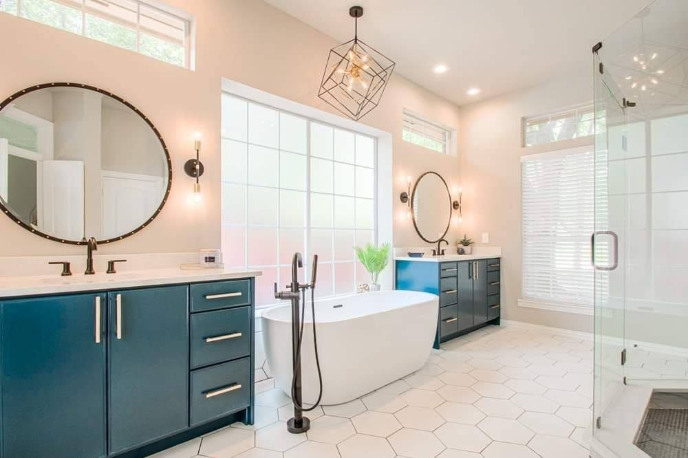 The bathroom was fully renovated, replacing outdated finishes with modern ones. We installed custom flat-front vanities in a vibrant blue and topped them with durable quartz countertops. A unique mirror and elegant wall sconces add even more interest to the area, enhancing both functionality and style. We replaced the old drop-in tub and tub filler with a contemporary freestanding tub and floor-mounted filler. Hexagon tile on the floors gives the room even more visual interest. The shower was reimagined to feel more open and luxurious. We lowered the curb installed frameless glass, put in dual shower heads, handheld sprays, and a custom shampoo niche with a stunning accent tile.
