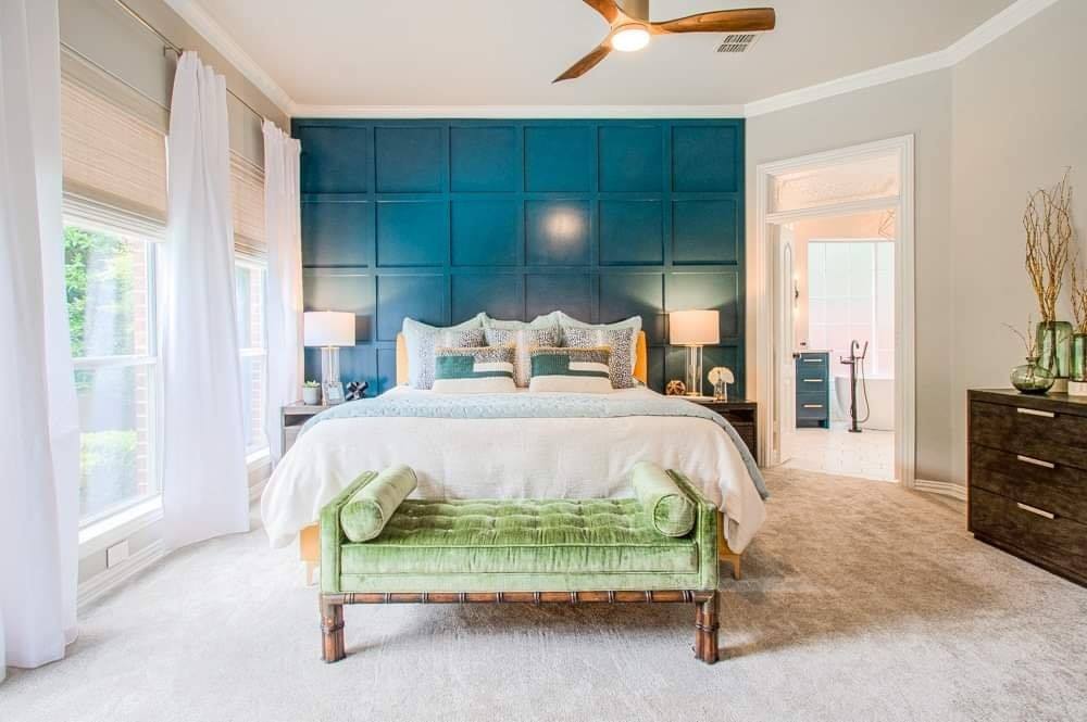 This project extended into the primary bedroom, where we continued the transformation. We replaced the carpet, and added a custom board-and-batten accent wall that now serves as a striking focal point behind the bed.